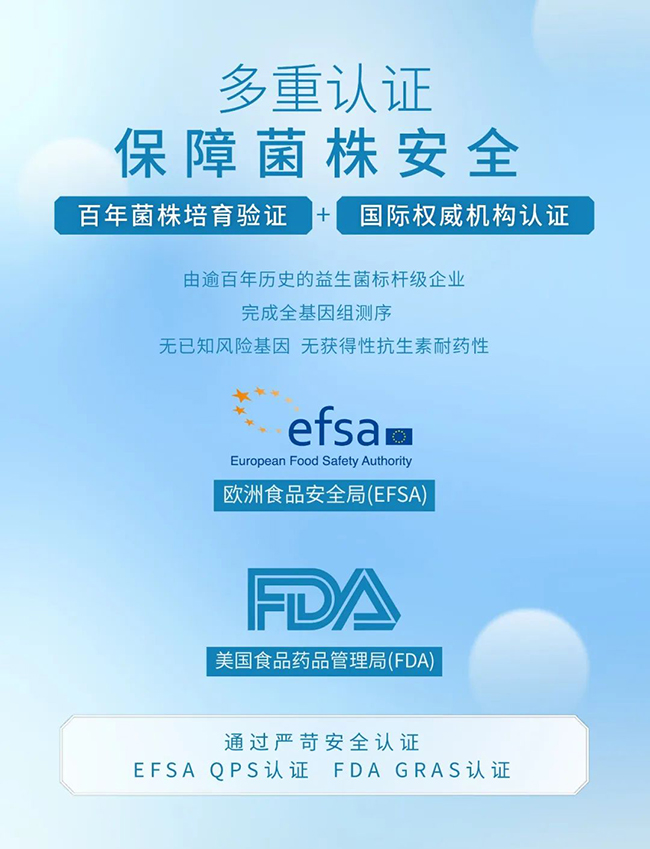 同時(shí),養(yǎng)顧問所選菌株均已完成全基因組測(cè)序,無已知的風(fēng)險(xiǎn)基因,無獲得性抗生素耐藥性,且全部通過美國(guó)FDA GRAS認(rèn)證,菌種已通過歐洲EFSA QPS認(rèn)證;養(yǎng)顧問所含5個(gè)菌株均在國(guó)家衛(wèi)健委發(fā)布的《可用于食品的菌種名單》,其中2株收錄于國(guó)家衛(wèi)健委發(fā)布的《可用于嬰幼兒食品的菌種名單》。