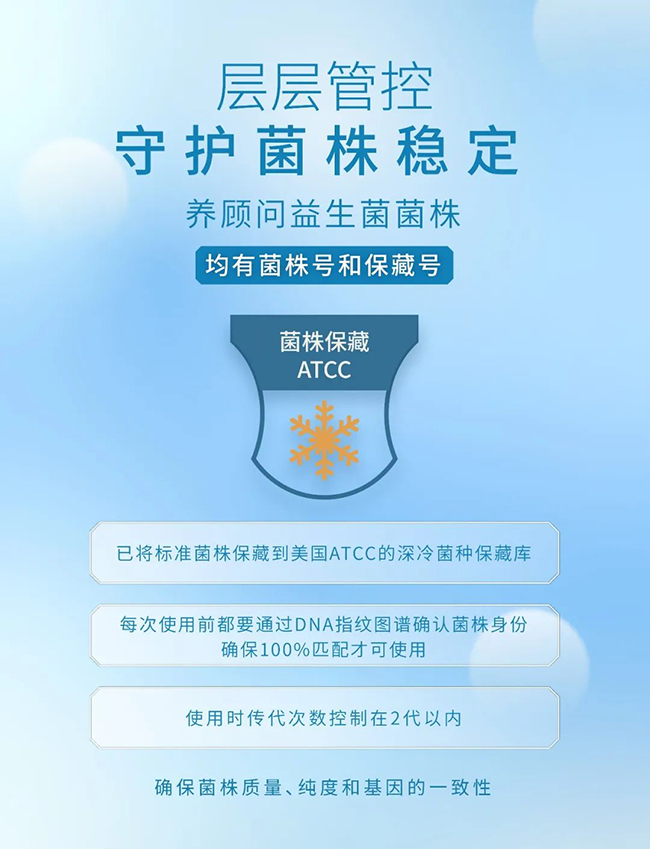 養(yǎng)顧問所選菌株全部保藏于世界上最大的生物資源中心——美國(guó)ATCC的深冷菌種保藏庫(kù),傳代次數(shù)嚴(yán)格控制在2代以內(nèi),以確保菌株的質(zhì)量、純度和基因的一致性,并且全部有菌種名、菌株號(hào)、保藏號(hào),可實(shí)現(xiàn)全程追溯。