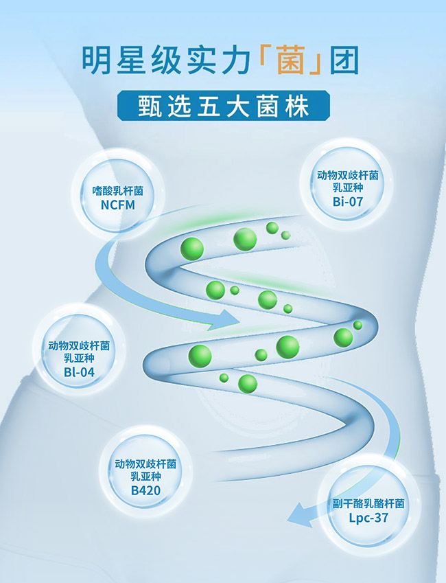 養(yǎng)顧問所選菌株均由美國(guó)逾百年歷史、全球公認(rèn)益生菌標(biāo)桿企業(yè)定制,多項(xiàng)先進(jìn)科技確保養(yǎng)顧問采用的嗜酸乳桿菌NCFM、乳雙歧桿菌B420、乳雙歧桿菌Bi-07、副干酪乳桿菌Lpc-37、乳雙歧桿菌Bl-04五個(gè)菌株的安全和穩(wěn)定。