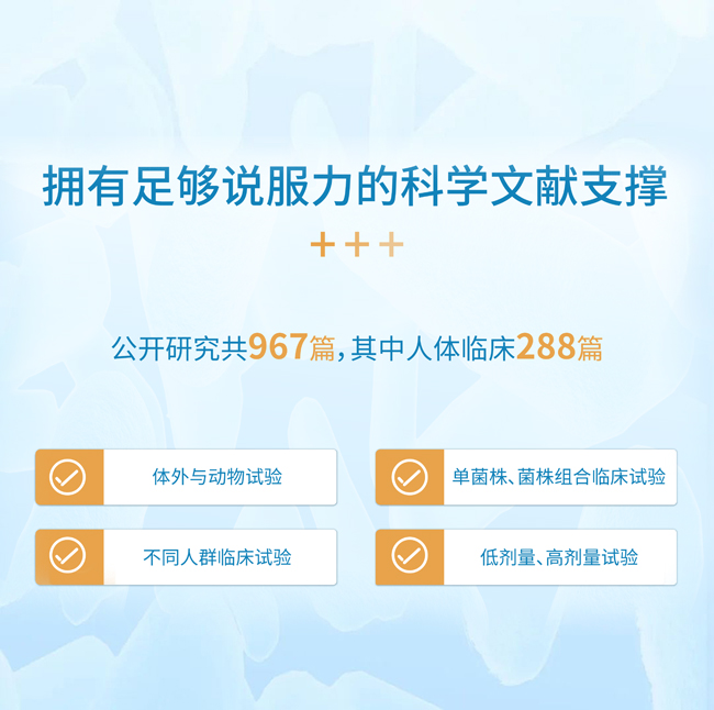 養(yǎng)顧問所選用菌株的另一優(yōu)勢(shì)在于,全部成功通過細(xì)胞水平的菌株培養(yǎng)與篩選、胃腸道模擬試驗(yàn)、體外與動(dòng)物試驗(yàn)、人體臨床試驗(yàn)這四關(guān),可以確保每個(gè)菌株在有效性方面具備充分的數(shù)據(jù)支撐。截至2021年1月,圍繞該五個(gè)菌株的研究文獻(xiàn)已公開發(fā)表701篇,其中,人體臨床研究多達(dá)191篇。