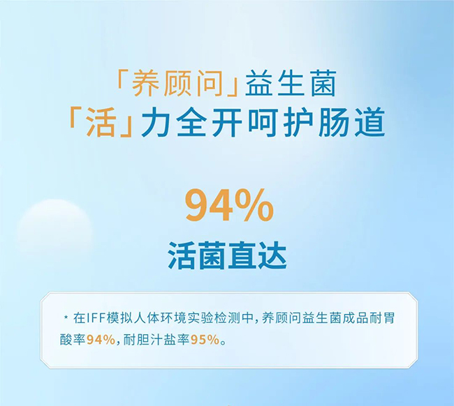 經(jīng)過測(cè)試,采用超低溫凍干技術(shù)的養(yǎng)顧問益生菌,在胃液中的存活率高達(dá)94%,在膽汁鹽中的存活率更是達(dá)到了95%,這樣的成績(jī)單,讓高活性、高穩(wěn)定、高定殖成為現(xiàn)實(shí)。這兩項(xiàng)亮眼的數(shù)據(jù),也為益生菌行業(yè)樹立了新的標(biāo)桿。