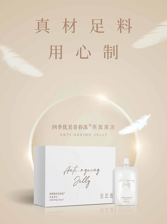每一袋四季優(yōu)美青春凍燕窩果凍所含干燕窩更是多達1.2g,同時,魚膠原蛋白肽、葛根粉、奇亞籽、水蘇糖、低聚木糖、低聚果糖等多種珍貴原料的加入,使四季優(yōu)美青春凍在營養(yǎng)價值、飽腹感及產品綜合體驗方面,都實現(xiàn)了顯著的提升,每天一袋,即可滿足日常滋補所需,滿滿的真材實料,口感更好吃,內涵更健康。