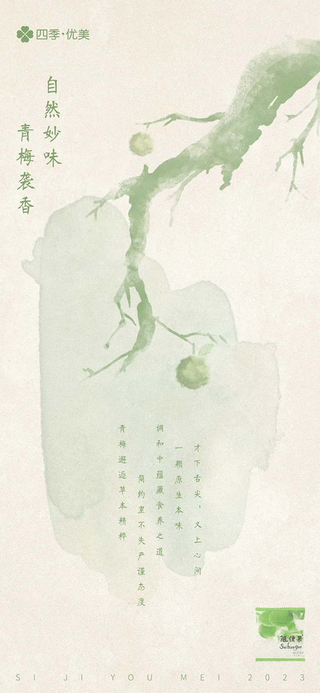 每一個季節,青梅都懂得如何討得人間的歡喜,用楚楚的形、盈盈的色與變化萬端的味,演繹著屬于它們的四“食”風雅。在略帶孤寂的冬天,隨便果——這顆糖漬青梅,為冷冷的日子悄然添上幾許暖意。