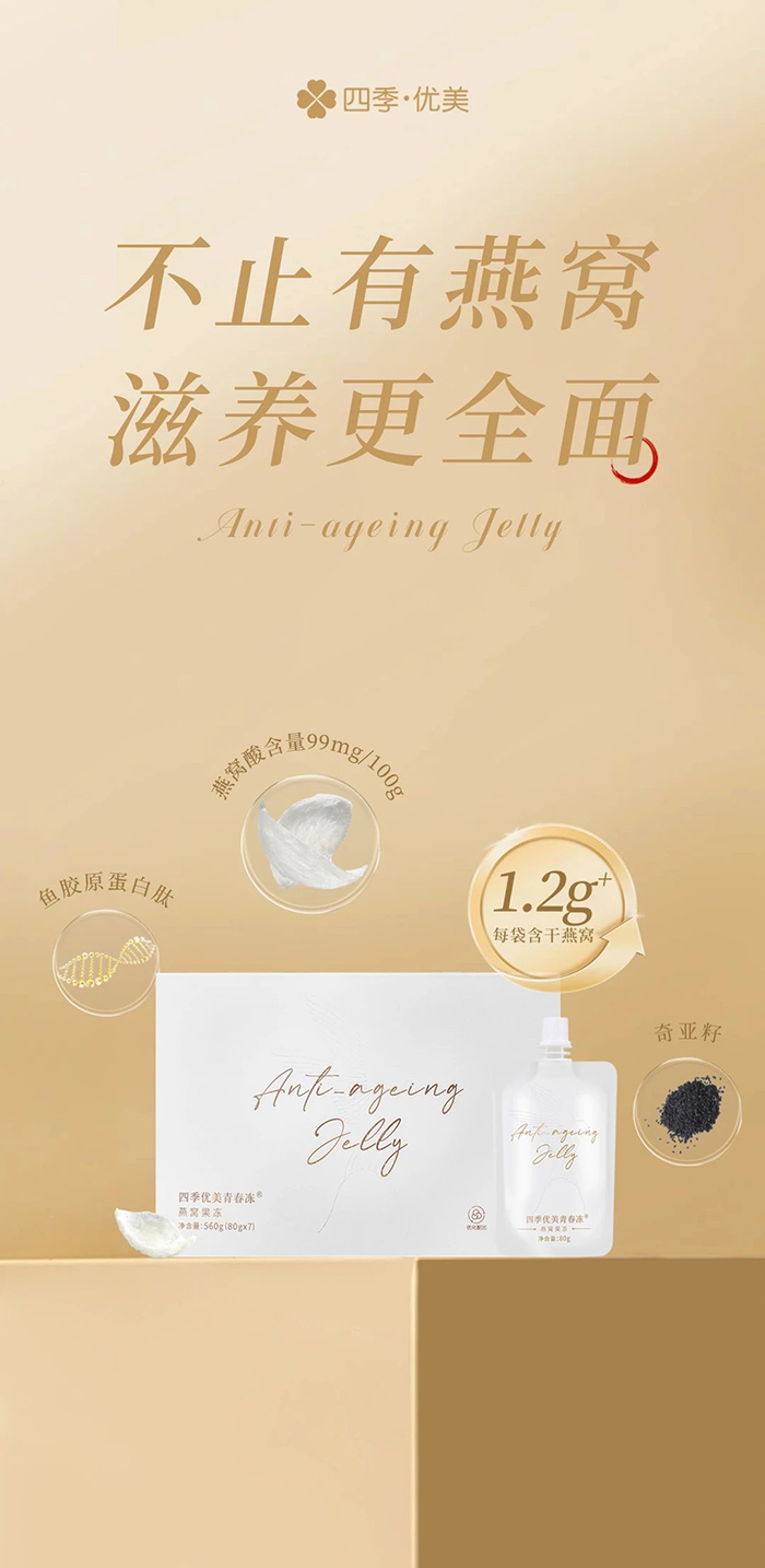 在飲食美學的殿堂里,燕窩以其獨特的韻味,詮釋著“少即是多”的哲學。無需繁復的調味,僅以清水慢燉,便能激發出它最本真的甘甜與細膩。這份簡約,恰如人生中的留白,值得無限的回味與遐想。同時,燕窩又是“兼容并包”的食材典范,無論是百合、雪梨,還是木瓜、芒果,或者枸杞、紅棗,都能與它擦出動人的火花,演繹出舌尖上的美好。就像這一袋四季優美青春凍,除了至少1.2克的可溯源優質干燕窩之外,還貼心地根據現代人的身體所需,額外加入了魚膠原蛋白肽、葛根粉、奇亞籽、水蘇糖、低聚木糖、低聚果糖等多種原料,使四季優美青春凍在營養價值、飽腹感及產品綜合體驗方面,都實現了顯著的提升,為追求“清、調、補、養、固”的消費者們帶來更值得期待的選擇。